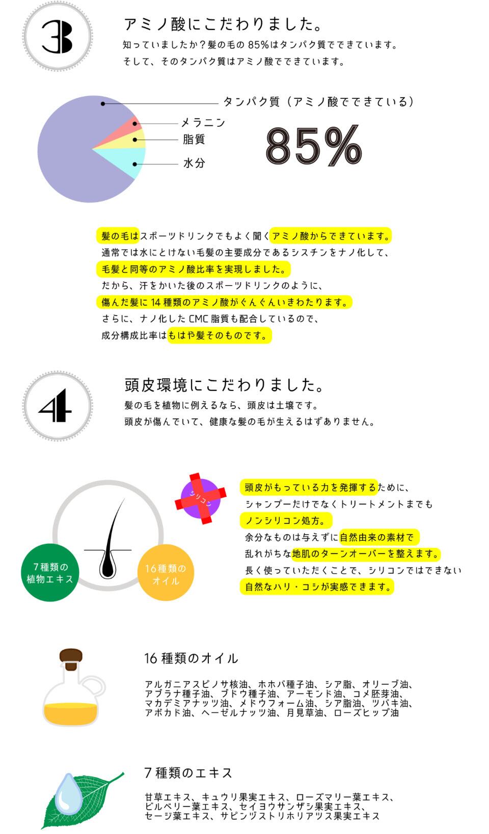 水、ラウロイルメチルアラニンNa、コカミドメチルMEA、コカミドプロピルベタイン、ココイルグルタミン酸TEA、アルガニアスピノサ核油、ホホバ種子油、シア脂、オリーブ果実油、アブラナ種子油、ブドウ種子油、アーモンド油、コメ胚芽油、マカデミア種子油、メドウフォーム油、シア脂油、ツバキ種子油、アボカド油、ヘーゼルナッツ種子油、月見草油、カニナバラ果実油、サピンヅストリホリアツス果実エキス、キュウリ果実エキス、セイヨウサンザシ果実エキス、セージ葉エキス、ビルベリー葉エキス、ローズマリー葉エキス、甘草エキス、ベタイン、PCA-Na、ソルビトール、セリン、グリシン、グルタミン酸、アラニン、リシン、アルギニン、トレオニン、プロリン、乳酸Na、アスパラギン酸、EDTA-2Na、PCA、バリン、イソロイシン、ヒスチジン、フェニルアラニン、クオタニウム-18、クオタニウム-33、コレステロール、加水分解ケラチン(羊毛)、白金、シスチン、ヒアルロン酸Na、ジステアリン酸PEG-150、安息香酸、ポリクオタニウム-10、(PCA/イソステアリン酸)PEG-40水添ヒマシ油、PG、BG、イソプロパノール、メチルパラベン、グリセリン、クエン酸、クエン酸Na、フェノキシエタノール、香料、カラメル
